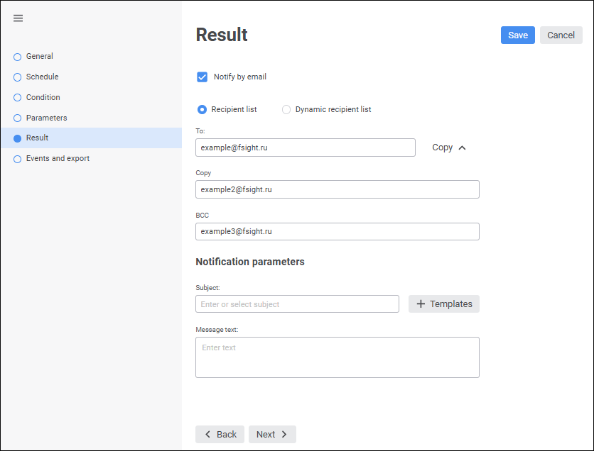 Recipient List. To select a list of emails, users or groups of users to whom the report about task execution will be sent, follow the steps: