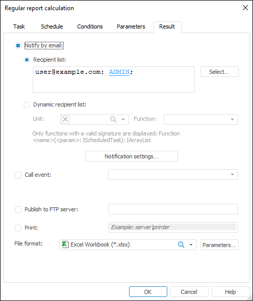 Additional parameters of result handling are available for the Regular Report Calculation task: