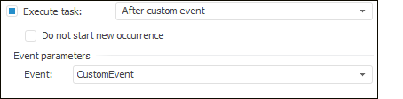 Event Parameters. In the drop-down list select the custom event which generation executes the task. In the drop-down list the available events are determined on the Custom Metadata > Events tab of the dialog of repository parameters setup.