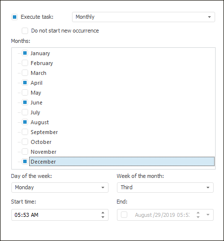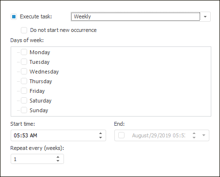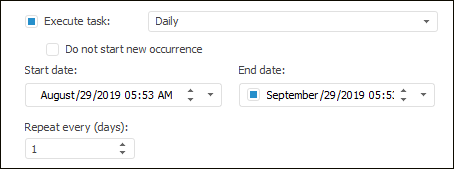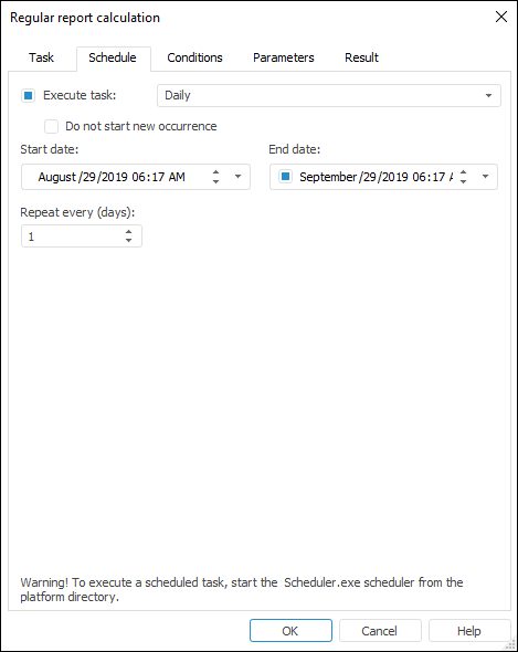 Do not Start New Occurrence. Selecting this checkbox enables the user to avoid simultaneous execution of several occurrences of the same task: the task is not started until the previous occurrence of this task is completed. If one or several scheduled task's starts have been skipped during task execution, they are executed in turn.