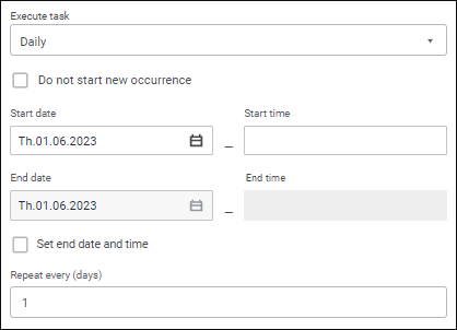 End Date/End. It sets date of the last task execution if the Set End Date and Time checkbox is selected. In the desktop application selecting the End checkbox sets date and time of the last task execution, after which the task will not be longer started for execution. The checkbox is disabled by default.