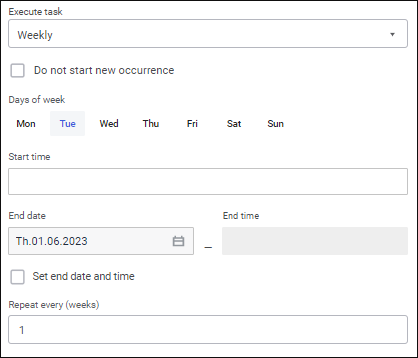 End Time. It sets time of the last task execution. It is available only in the web application.