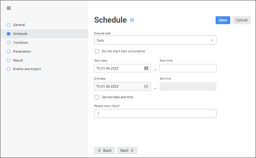 Various execution frequency types can be set up for task: once, daily, weekly, monthly, and also if a system or custom event occurs.