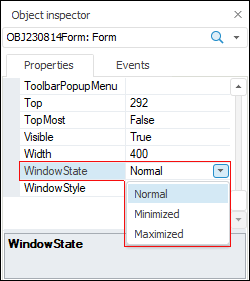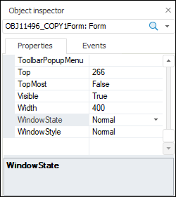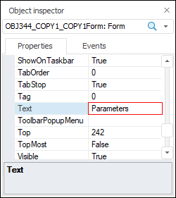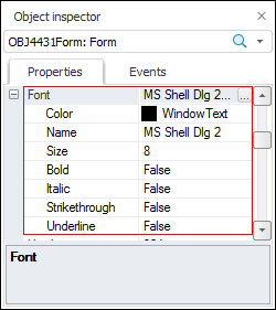 Properties are object attributes. To edit property value, select the required property in the object inspector and determine its value in the second column. A new property value is saved after the property loses focus or after the ENTER key is pressed. If the entered property is invalid, the previous value is restored.