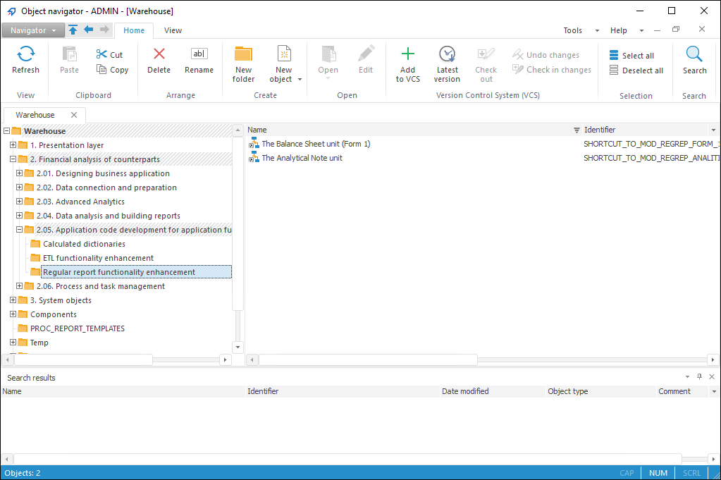 After repository is connected to version control system, the following appears: the Version Control System (VCS) section on the object navigator ribbon and corresponding commands in the objects' context menu: