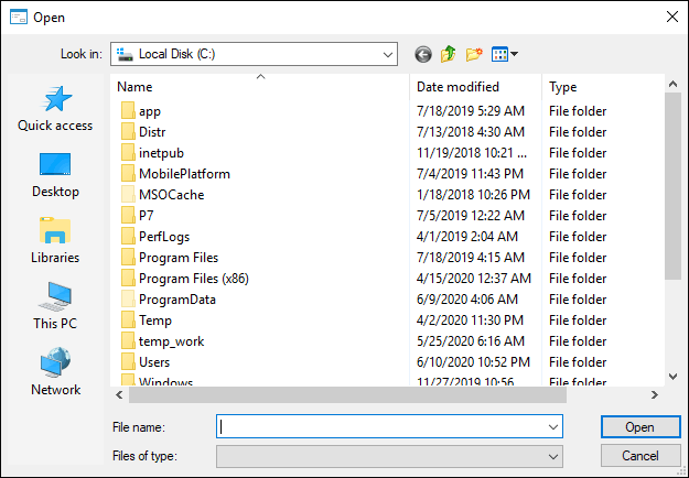 Various component properties can be used to determine which files can be selected in the dialog box. To initialize the dialog box, call the Execute method in the code. After selecting the folder and clicking the Save button the file is available in the FileName property. If more than one file is selected, the selected collection is available in the FileNames property.