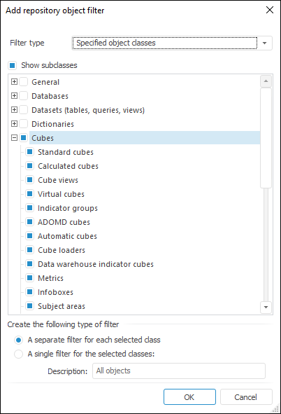 In the class tree, select object classes, which are available when this filter is used. Use the Show Subclasses checkbox to disable displaying of additional object classes in the tree.