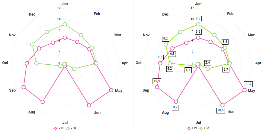 Example of radar chart (standard and with data labels):