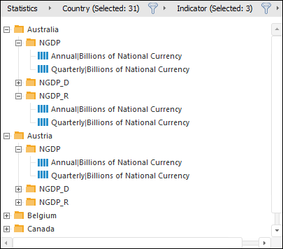 A series tree shows the tree structure of the open data source elements. The structure of the series tree is based on the chain of attributes defined in the breadcrumb. Levels of the hierarchy of the series tree are shown as folders, which names correspond to attribute values. Multiple elements can be selected in the series tree by holding down SHIFT or CTRL.