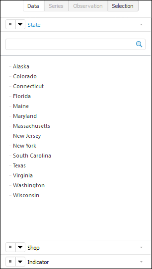 Changing the order and the contents of attributes is performed in the breadcrumb using the Selection group of tabs on the side panel. Each tab corresponds to the data source attribute and contains a search string and a list of attribute values.