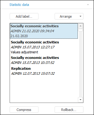Therefore, a label is created if it is required to make a copy of the data at the current moment, for example, at the beginning of the month or before start of complex tests, which may cause errors in the data. It will allow later to bring back the data at the moment of creating the label using the changes rollback.