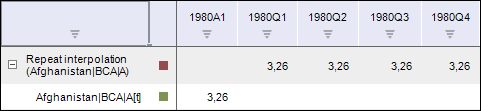 Interpolation by time (repeat). Disaggregates data by repeating values of the source series frequency.