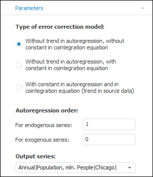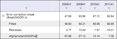 After the method is applied, the calculated series of the Error Correction Model(<Exogenous_Variables_List>) type based on the selected series and containing calculation results is added to the workbook. For example: