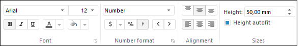 To set up title appearance, use the groups of commands: Font, Number Format, Alignment, Sizes, located on the Title ribbon tab.