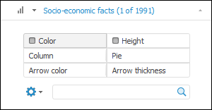 By default, the metrics dimension determines only territories fill color and data sources for pie and column charts on a map. If the 3D mode is enabled, showing markers, arrows or other parameters is enabled, the set of controls is shown on the dimension tab. For example: