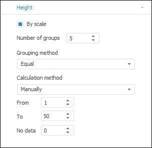 The side panel tab is used to set up the height of map elements. The height is calculated by a scale, which determines the set of number intervals and the height of the map for each interval.