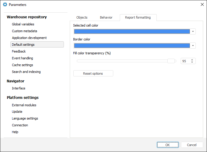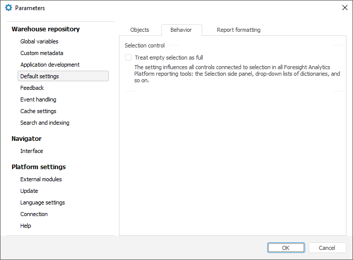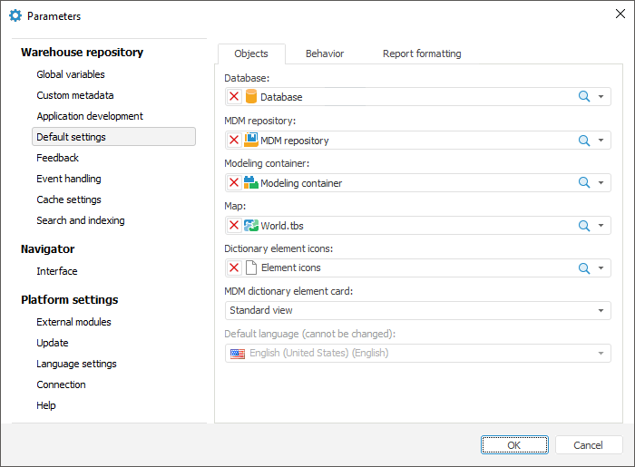 Default repository settings can be used to set objects, object behavior, formatting of selected table elements in Foresight Analytics Platform tools with no need for their repeated selection or setup. For example, a default map will be used in all reports.
