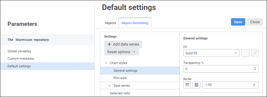 To set up chart styles in reports, use the Chart Styles group of parameters Chart Styles in the Settings area and set the parameters: