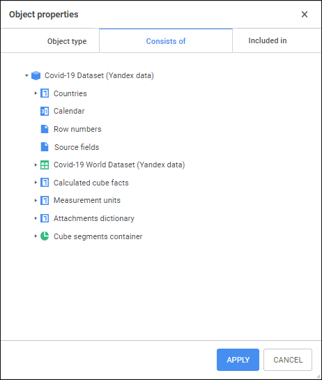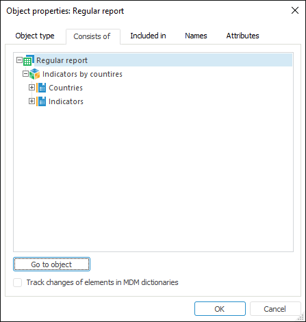 The Consists Of tab displays the hierarchy of objects, which this object consists of. The function tracks sources-to-reports data chains. For example, for a report it displays a tree of used cubes, dictionaries, tables, connections to sources.