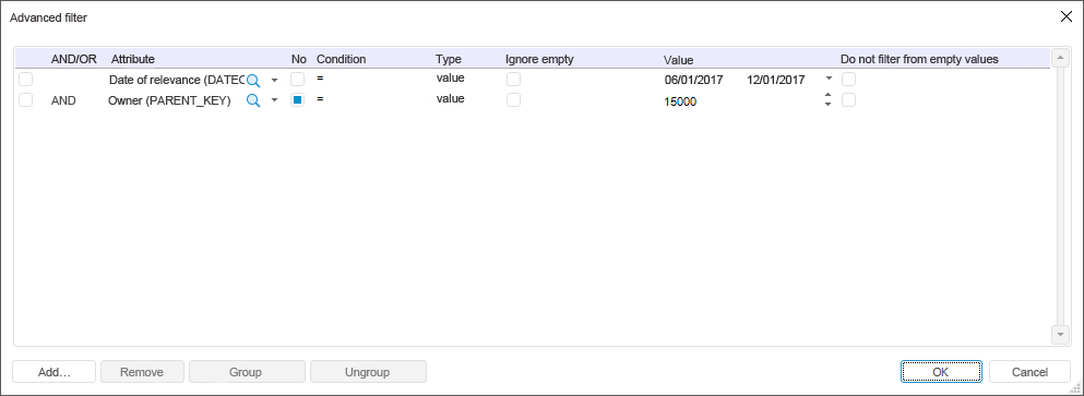 To sequentially group filtering conditions, select checkboxes next to conditions in the first column and click the Group button. After executing the operations the selected filtering conditions are grouped: