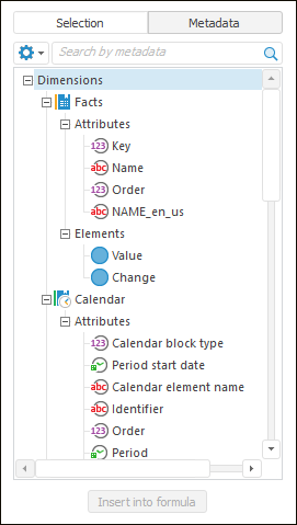 NOTE. Metadata-based operands can be inserted into all expressions, except for MDX expression for ADOMD cube dimension and expressions in the Modeling and Forecasting tool.