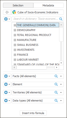 Select the Selection radio button on the data panel. All data source dimensions will be displayed. By default, the dimension, for which an expression is created, is displayed first. Elements of this dimension are displayed as a list, elements of other dimensions are displayed as drop-down lists. For example: