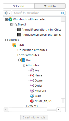 Select the Metadata radio button on the data panel to display metadata. The hierarchical list of all data source dimensions is displayed. A list of attributes and a list of elements are displayed for each dimension. For example: