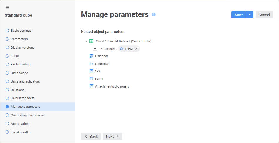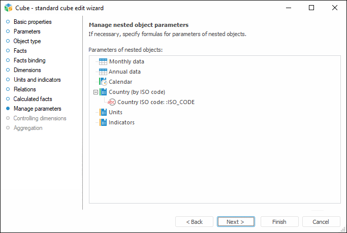 Opening a cube also opens all objects used by this cube. If the objects have parameters, parameter values should be passed to open objects. The Manage Parameters page is used to set up object parameters.