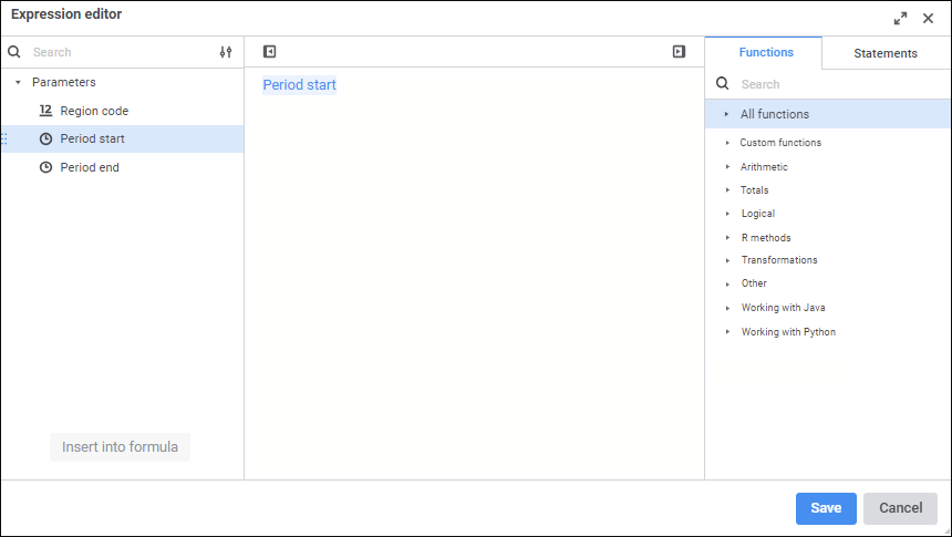The expression editor in the desktop application is uniform for all platform tools and objects. The uniform expression editor is described in the Creating Formulas and Expressions document.