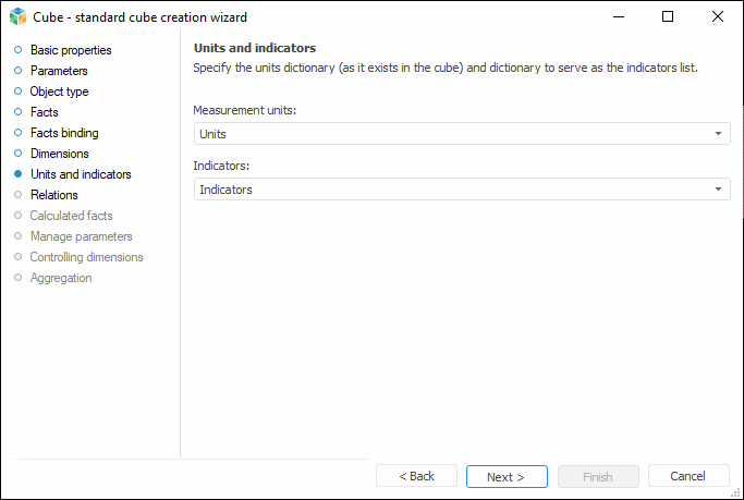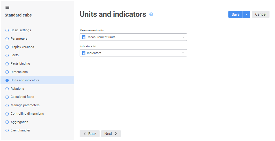 Select the dictionaries in the drop-down lists that contain all existing cube dictionaries. These dictionaries should have a specific structure. The structure is described in the Setting Up Measurement Units and Indicators List in Cube section. If the structure of the selected indicators or units dictionary does not satisfy the required conditions, a warning message is displayed.