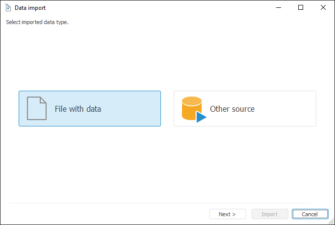 Select type of the source, from which import is executed, and click the Next button.