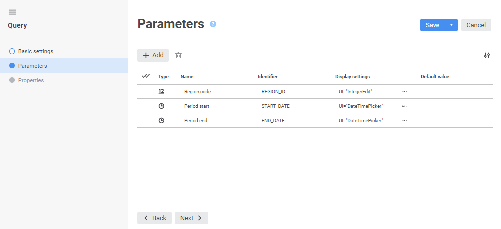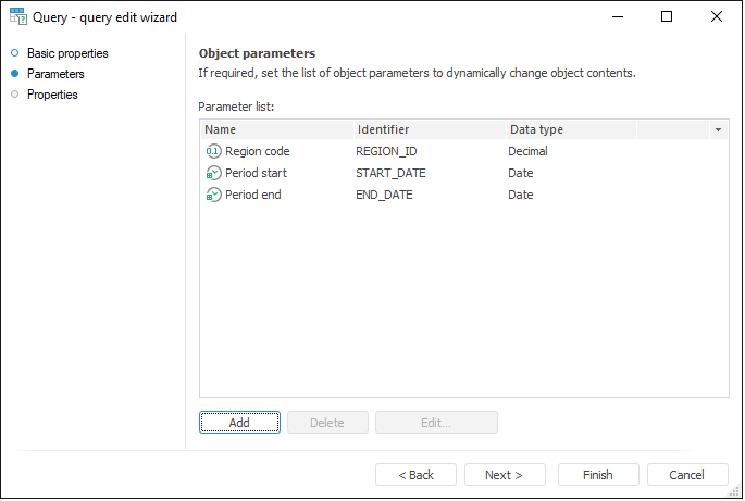 The Parameters page is used to set the list of object parameters. Parameters enable the user to dynamically generate object contents.