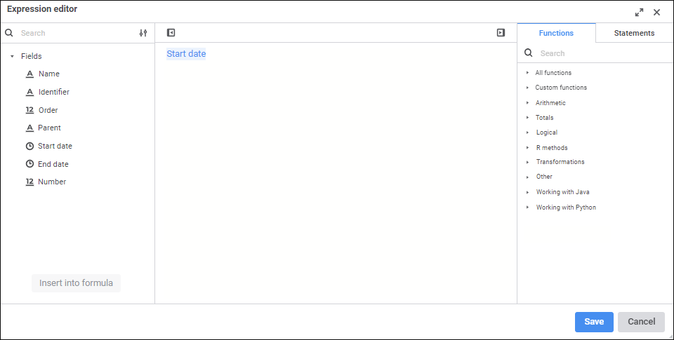 The expression editor in the desktop application is uniform for all platform tools and objects. The uniform expression editor is described in the Creating Formulas and Expressions document.