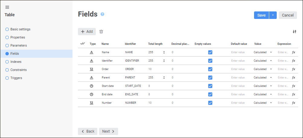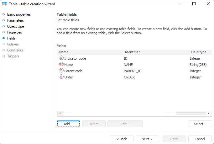 On the Fields page determine the structure of the table being created, that is, specify the list of table fields and their properties.