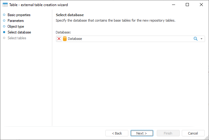 External table. A virtual table that fully duplicates table in the database. Editing data in the external table causes data changes in the source table. Deleting an external table does not cause deleting of the source table: