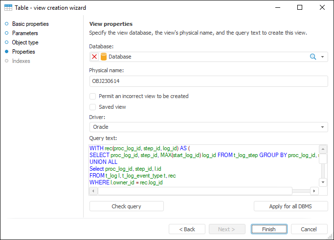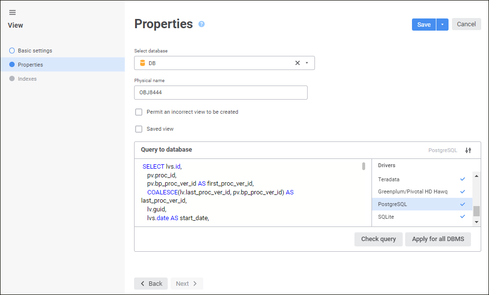 View. A virtual table with the ability of indexation based on SQL query to one or several physical tables in the database or in some external database. Data editing is available if several conditions are satisfied. Deleting a view does not affect tables in the repository database:
