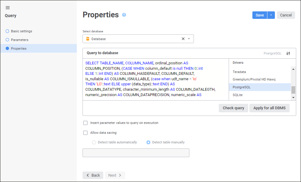 Data sets support parameterization method, which is used to dynamically edit data sampling conditions for the set. If the data set contains parameters, the user should enter parameters values every time he addresses the set. The default parameters can also be set. If a dictionary is based on the data set, data set parameters enable the user to manage the contents of dictionary elements.