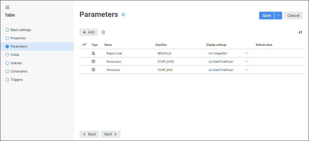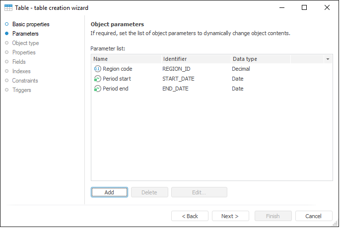 The Parameters page is used to set the list of object parameters. Parameters enable the user to dynamically generate object contents.