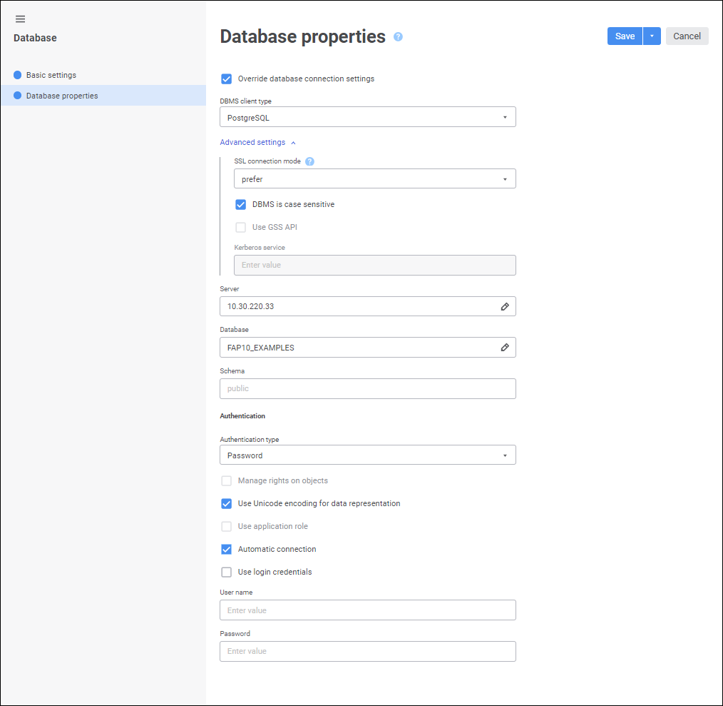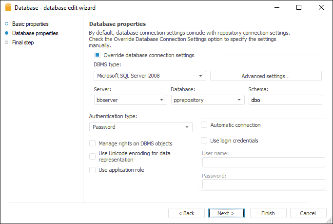 Database Properties. The page is used to determine database management system (DBMS) type installed on the server and additional connection parameters.