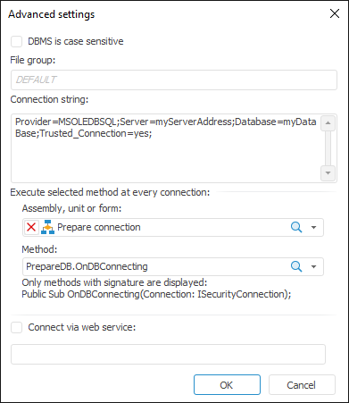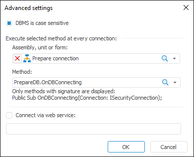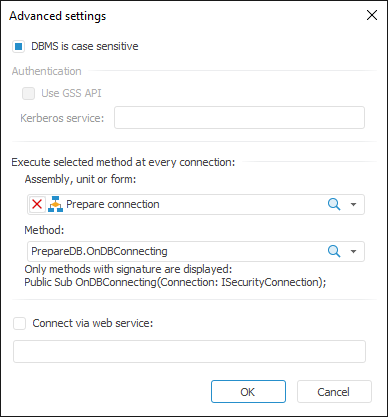 Connect via Web Service. When the checkbox is selected, connection to database and working with DBMS objects are executed via web service. In the box specify BI server URL, via which DBMS queries will be sent.