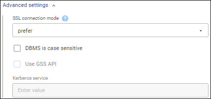 After executing one of the operations the Advanced Settings set of parameters opens in the web application or the Advanced Settings dialog box opens in the desktop application. Parameters depend on the selected DBMS client type used for database connection: