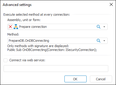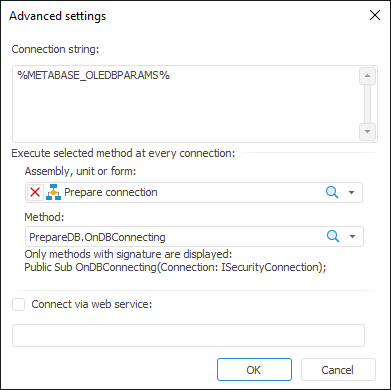 Assembly, Unit or Form. One can determine the macro that is executed on each connection regardless of the type of DBMS in use. To do this, in the drop-down list select the unit, form, or assembly, in which the macro is implemented. The list of available methods is generated in the Method drop-down list. Available static procedures with one parameter of the ISecurityConnection type: