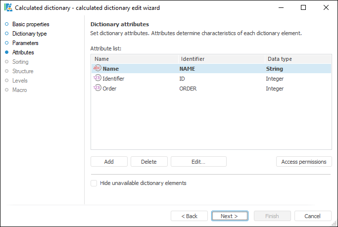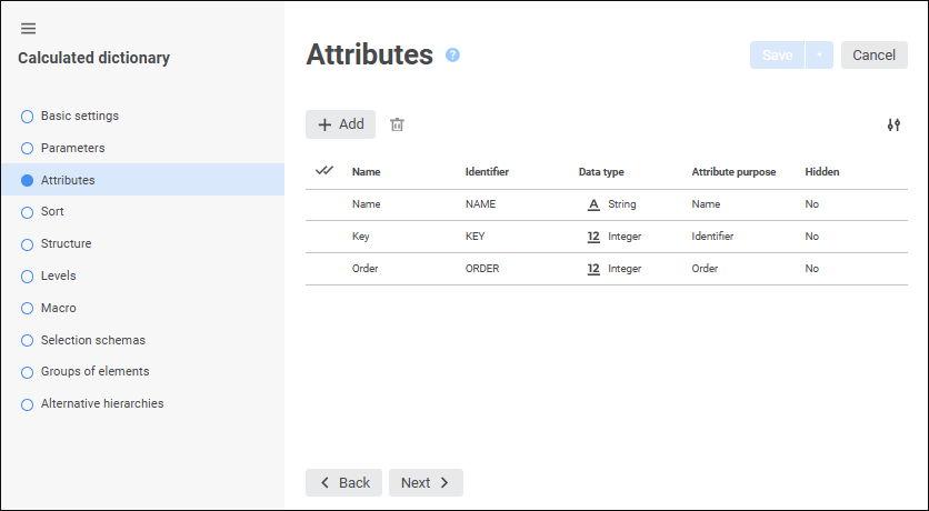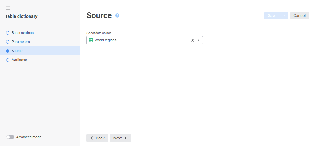 Table dictionary. A dictionary is used for structured presentation of elements without the ability to add or edit them. To create a dictionary, one requires a table data set, MDM dictionary, or composite MDM dictionary. Each data source record is a dictionary element that must contain definitions of all dictionary attributes. The user can use various filters to limit the amount of data, which is loaded to the dictionary. A table dictionary can manage contents by means of parameters, that is, it is a dynamic dictionary. It can be created in any place of the repository: