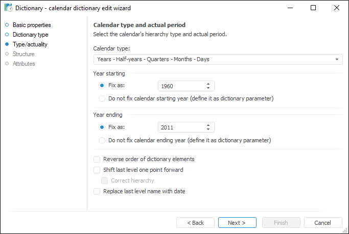 Building this type of dictionary does not require creating tables and linking table elements. The user only needs to select calendar levels, whereas elements and their interaction are generated by the system: