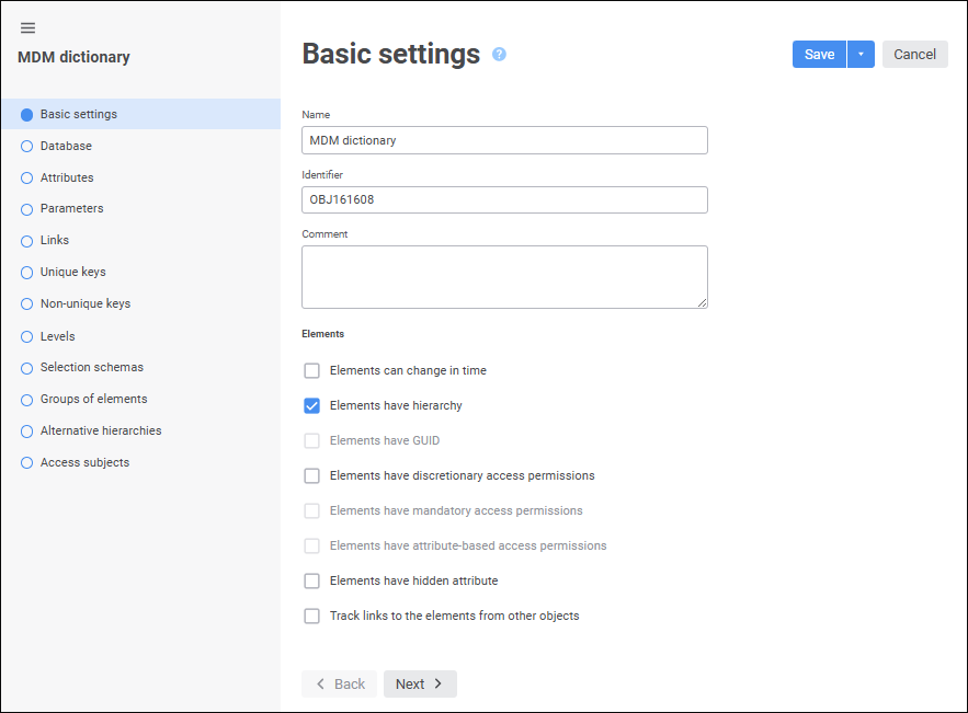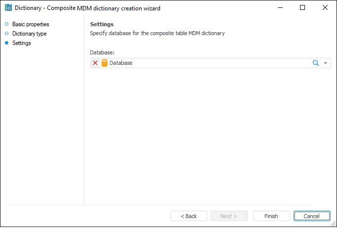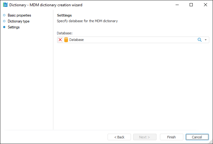 MDM dictionary. The dictionary is used to create a structured data presentation with the ability of its transformation. Creating a dictionary does not require a data source. Data can be entered manually or loaded from the data source to the dictionary by means of the built-in ETL tools. Dictionary elements may change in time, that is, may have several versions. An MDM dictionary can be created in any place of repository. An MDM dictionary uses a single table to store data. A table is created automatically on creating a dictionary and is the dictionary child object. Table fields correspond to dictionary attributes: