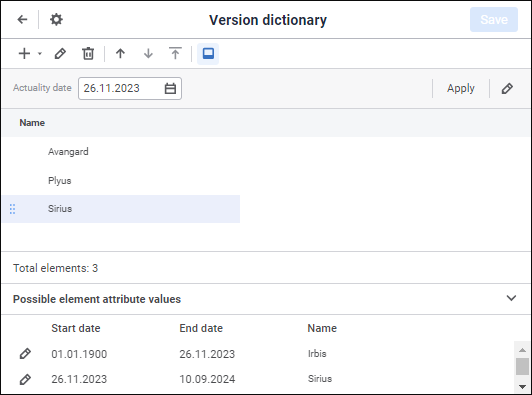 For example, the Irbis company changed its name after 11/26/2023 to Sirius. After executing all the mentioned operations, a new version of the Irbis dictionary element is created: