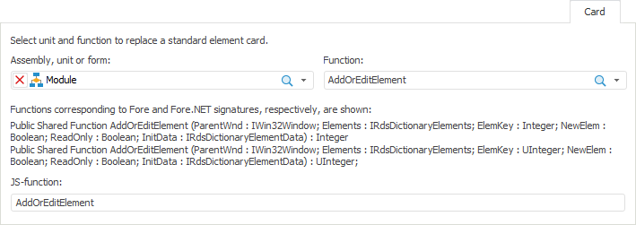 On the tab, in the drop-down list select assembly, unit or form and a function to replace the dialog box in the desktop application; specify the JS-function to replace the dialog box in the web application.