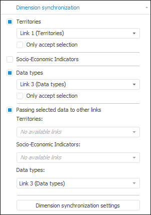 Data Selection Synchronization Settings. Selected data synchronization enables the user, for example, to rebuild a chart according to the table selection. To set up selected data synchronization, select the Passing Selected Data to Other Links checkbox. The list of dimensions of the data slice to set up is displayed. Each dimension has a drop-down list containing available links.