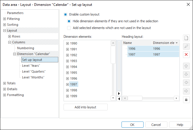 Custom layout setting is required if the user needs to show dimension elements in a custom order and/or with custom names.