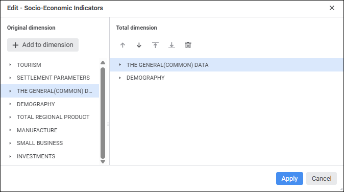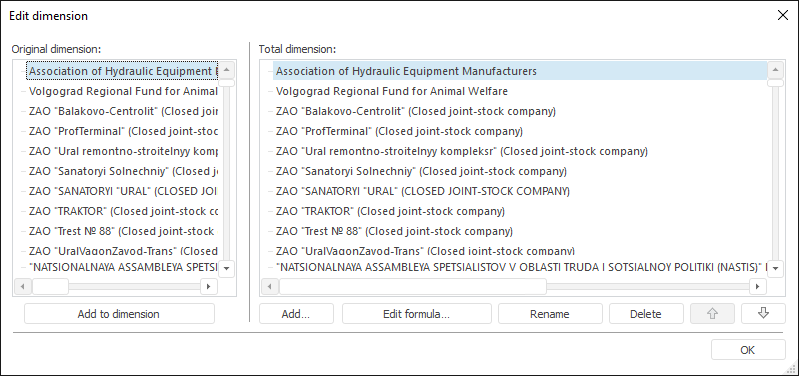Editing dimension is available in regular reports, express reports, dashboards, if all cube dimensions have a defined primary key. After the list of dimension elements is edited, custom hierarchy is applied.